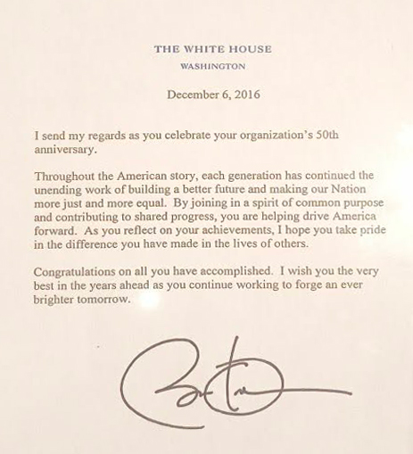 U.S. President Barack Obama sent a letter congratulating CARF International on its 50th anniversary.