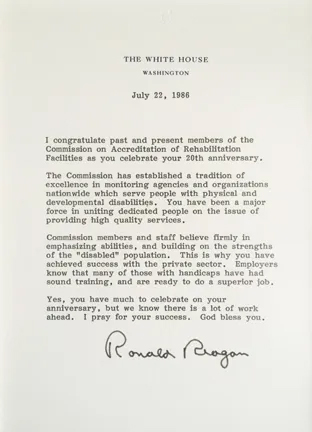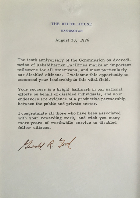 A congratulatory letter from President Gerald Ford said, “The tenth anniversary of the Commission on Accreditation of Rehabilitation Facilities marks an important milestone for all Americans, and most particularly our disabled citizens. I welcome this opportunity to commend your leadership in this vital field.