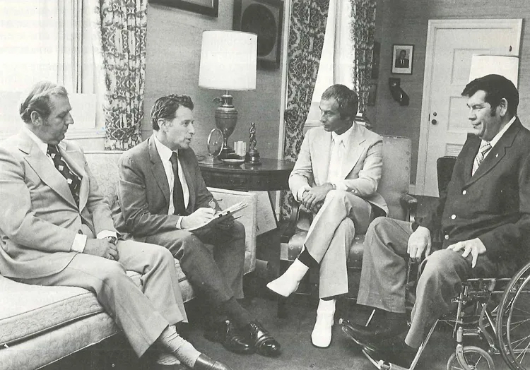 A meeting to discuss rehabilitation’s unique and decisive efforts in program evaluation, standards of performance, and accreditation. (Left to right) Dr. Andrew S. Adams, Commissioner of Rehabilitation Services; Caspar W. Weinberger, Secretary of Health, Education and Welfare [later renamed the Department of Health and Human Services]; Alan H. Toppel, Executive Director of CARF; and Ray R. Seitz, Vice Chairman of the CARF Board of Trustees.