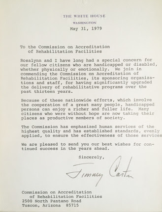 President Jimmy Carter recognized CARF for its significant efforts to upgrade the delivery of rehabilitation services to the nation’s citizens with disabilities.